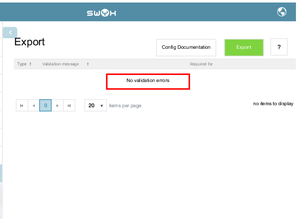 When on the page “Export” the message “No validation errors” appears, you can use the respective configuration file for the configuration of SwyxServer.