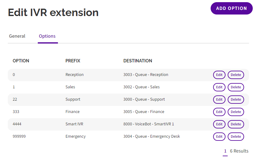 In the General settings of the IVR extension you can configure the maximum number of digits for IVR options. Allowed values are from 1 to 6. When 1 is configured (default value), menu options in the IVR can only use one digit (0 to 9). When 2 is configured, menu options in the IVR can have up to two digits (0 to 99), etc. When the maximum number of six digits is configured, IVR options can have up to 6 digits (0 to 999999).