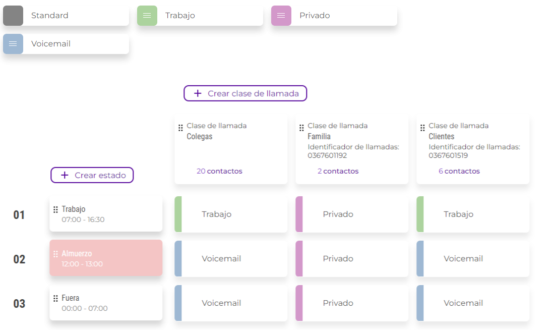 En el ejemplo, el usuario ha creado tres grupos de contactos, uno para colegas, otro para familiares y otro para clientes. Se han creado tres estados, un estado 'Trabajo', que está activo los días laborables entre las 07:00 AM y las 04:30 PM, un estado 'Almuerzo' de 12:00 AM. a las 01:00 PM los días laborables y un Estado 'Fuera' para todas las horas en las que el usuario está fuera de la oficina. Se han creado tres perfiles diferentes: Trabajo, Privado y Buzón de voz. Con el perfil ‘Trabajo’ se desvían llamadas al dispositivo fijo y móvil del usuario. El perfil 'Privado' desvía llamadas al teléfono móvil del usuario. En el perfil 'Buzón de voz', todas las llamadas entrantes se reenvían directamente al correo de voz.