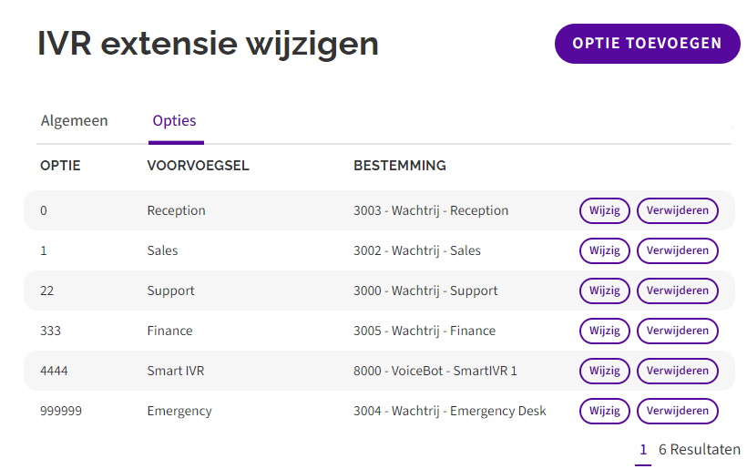 Binnen een IVR extensie kun je IVR-opties configureren met verschillende cijferlengtes, zoals in het onderstaande voorbeeld.