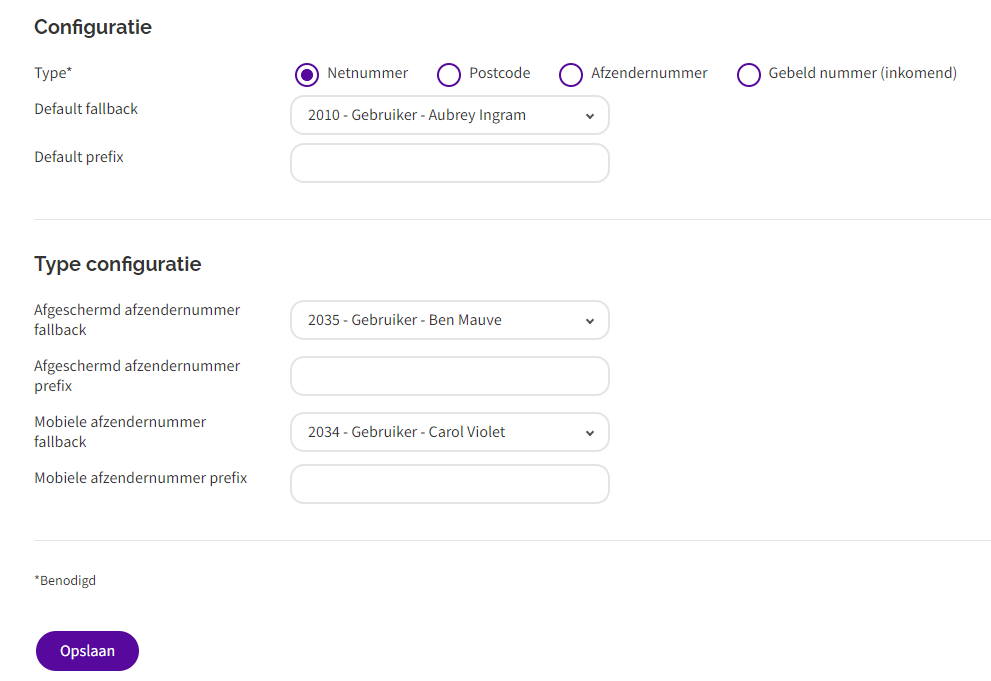 Voer de terugvalbestemming in die wordt gebruikt als de beller een nummer heeft gebeld dat niet is geconfigureerd.