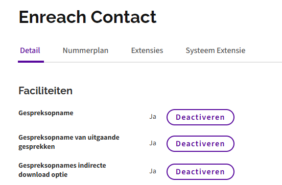 Als gespreksopname is geactiveerd voor de account, wordt een nieuwe optie Gespreksopname van uitgaande gesprekken toegevoegd onder Faciliteiten op het tabblad Detail.
