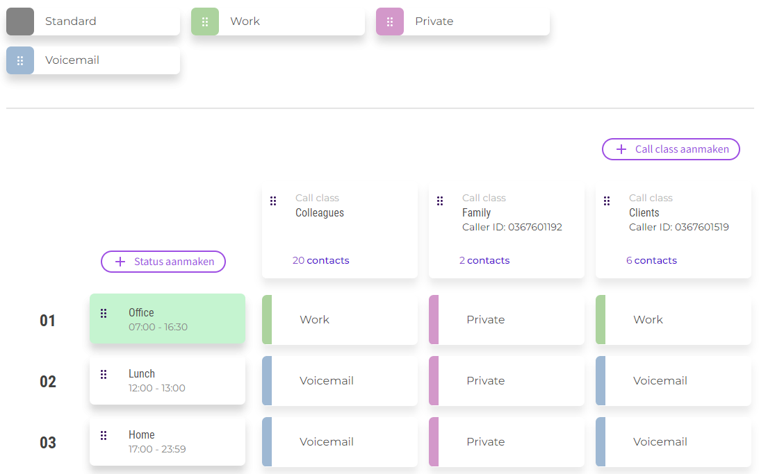 In het voorbeeld heeft de gebruiker drie contactgroepen gemaakt, één voor collega's, één voor familie en één voor klanten. Er zijn drie statussen aangemaakt, een 'Werk'-status, die actief is op werkdagen tussen 07:00 AM en 04:30 PM, een 'Lunch'-status van 12:00 AM tot 01:00 PM op werkdagen en een 'Uit'-status voor alle uren dat de gebruiker niet op kantoor is. Er zijn drie verschillende profielen gemaakt: Werk, Privé en Voicemail. Met het profiel 'Werk' worden gesprekken aangeboden naar het vaste en mobiele toestel van de gebruiker. Het profiel 'Privé' biedt oproepen naar de mobiele telefoon van de gebruiker. In het profiel 'Voicemail' worden alle inkomende oproepen rechtstreeks doorgeschakeld naar de voicemail.