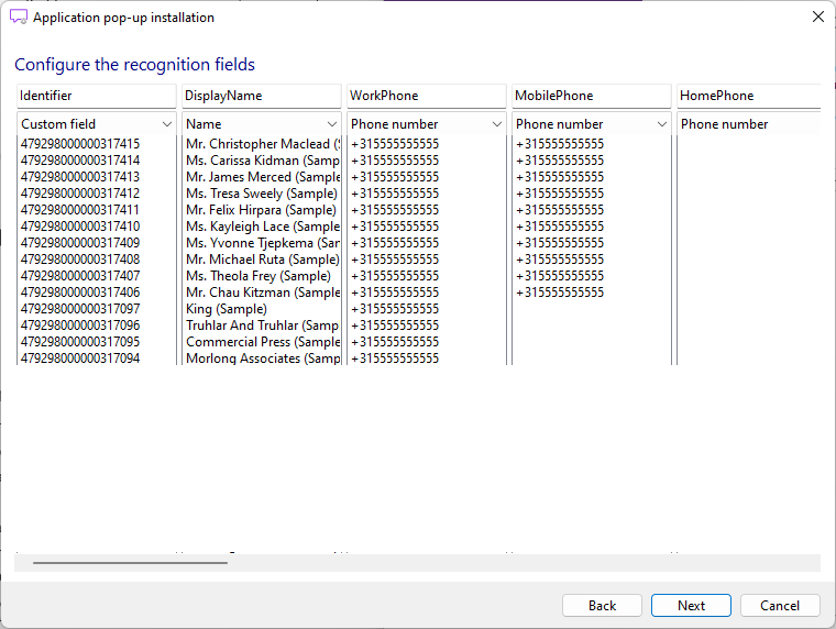 Si la herramienta de administración Enreach Contact no reconoce automáticamente las columnas con números de teléfono, puedes seleccionar manualmente las columnas correspondientes.