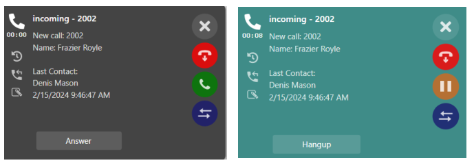 In addition to these buttons, the Contact CRM integration provides the option to enable a Call Control button. When this feature is enabled, the user will have a button in the Bubble pop-up notification to answer or hang up the call.