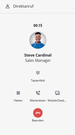 Sobald ein Anruf aufgebaut ist, können Sie das Tastenfeld öffnen, um DTMF-Ziffern einzugebe oder den aktiven Anruf an ein anderes Ziel weiterzuleiten, den Anruf in die Wartefelder zu legen und einen Gerätewechsel durchzuführen, um einen aktiven Anruf nahtlos an ein anderes Gerät weiterzuleiten.