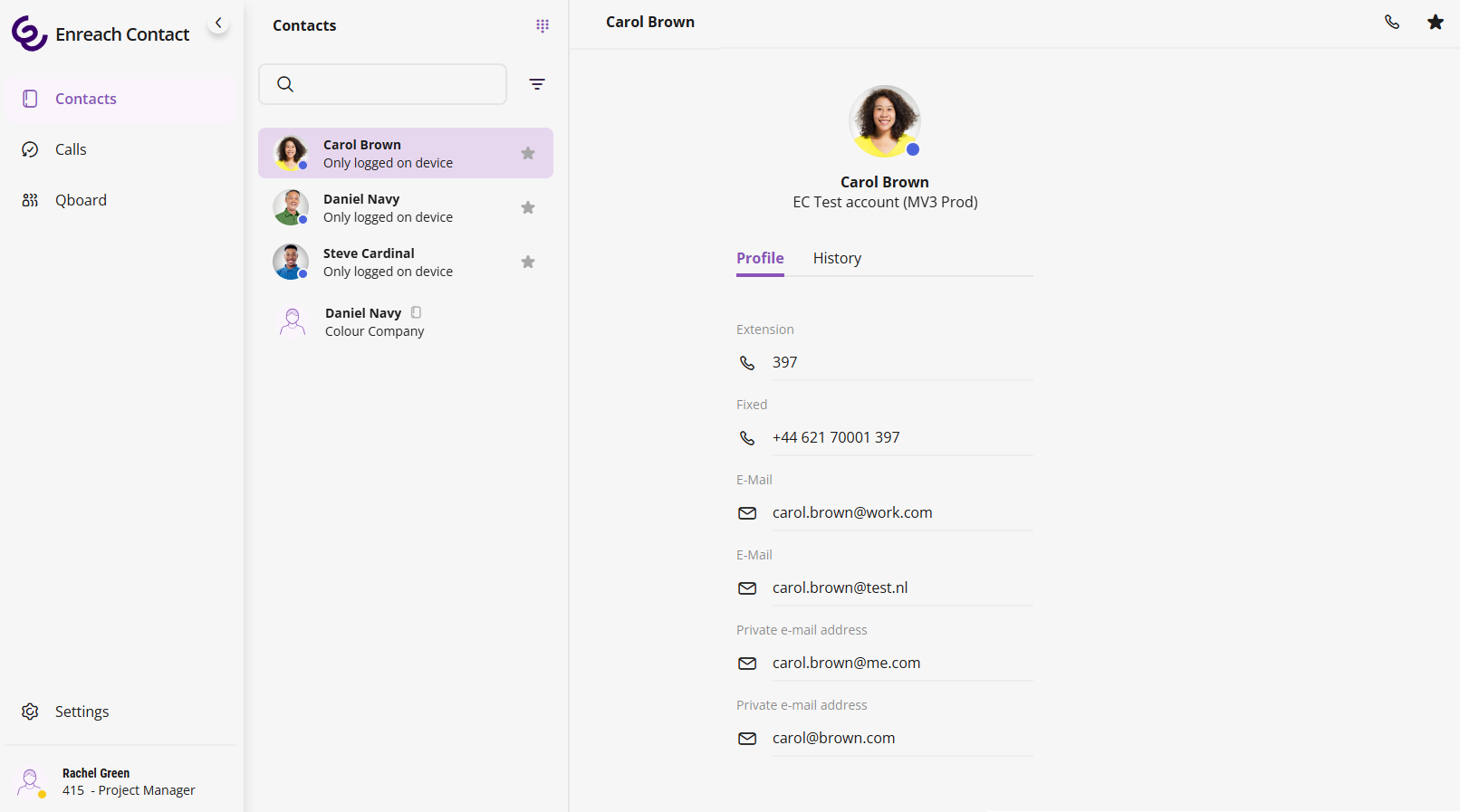 Profile – adjust your presence status, choose devices for incoming and outgoing calls, set your REACH status (override), and change the interface language