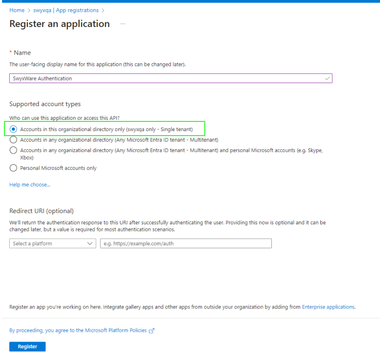 6 Unter Supported account types wählen Sie die Option Accounts in this organisational directory only (<accountg> only - Single tenant).