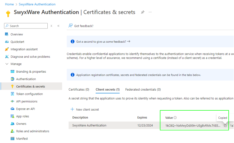 einen geheimen Clientschlüssen im Azure Portal erstellen und im Swyx Control Center eintragen,