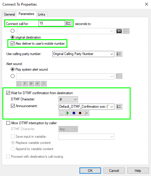 Das Zeil des Anrufs kann eine interne Ruffnummer des Benutzers oder der Gruppe sein. Bei der aktivierten Option „///original destination“ wird das Ziel im Rahmen des Skriptkontext angelegt.
