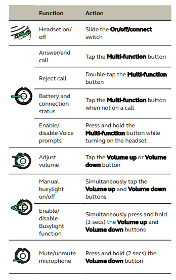You can use features of headsets in Enreach Contact Desktop. For example, if you want to answer a call, you can do so directly from your headset. Below is an example of what is possible with the Jabra Evolve 65 and 75.