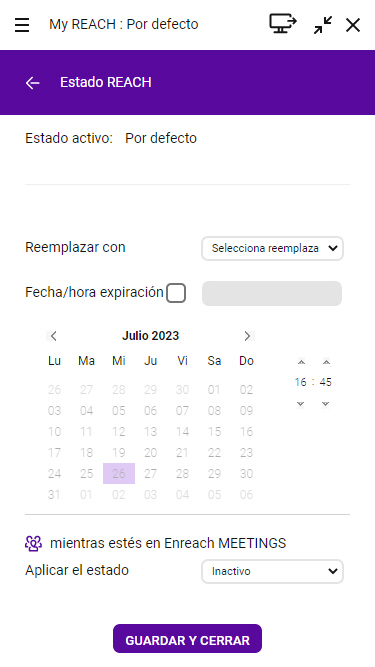El estado seleccionado se activa en cuanto estás en una sesión de Enreach Meetings o en una llamada de MS Teams.