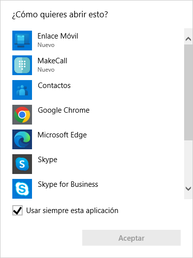 1 Selecciona «MakeCall» y marca la casilla Utilizar siempre esta aplicación.