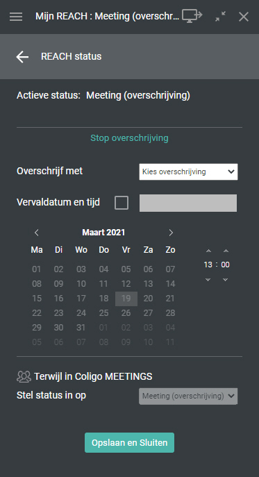 De gekozen status wordt actief zodra je in een Enreach Meetings sessie zit of in een MS Teams gesprek.