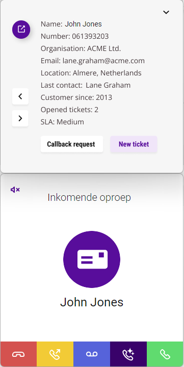 Wanneer geactiveerd, worden inkomende oproepen herkend en als het telefoonnummer van de beller bestaat in je CRM, ERP of contactenbestand, worden de naam en bedrijfsnaam, en indien van toepassing andere gegevens van het betreffende contact weergegeven in een melding.