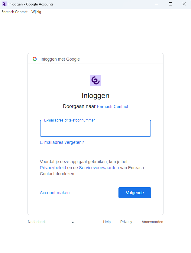 Google Integratie maakt het mogelijk om Google-contacten te integreren met Enreach Contact Desktop. Een inkomende oproep van jouw Google-contacten wordt weergegeven met de naam van de contactpersoon in Enreach Contact Desktop met behulp van Google integratie. Al jouw Google-contacten zijn ook te vinden in Enreach Contact Desktop in het Telefoonboek.