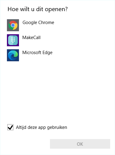 1 Selecteer „MakeCall" en activeer het selectievakje Deze app altijd gebruiken.