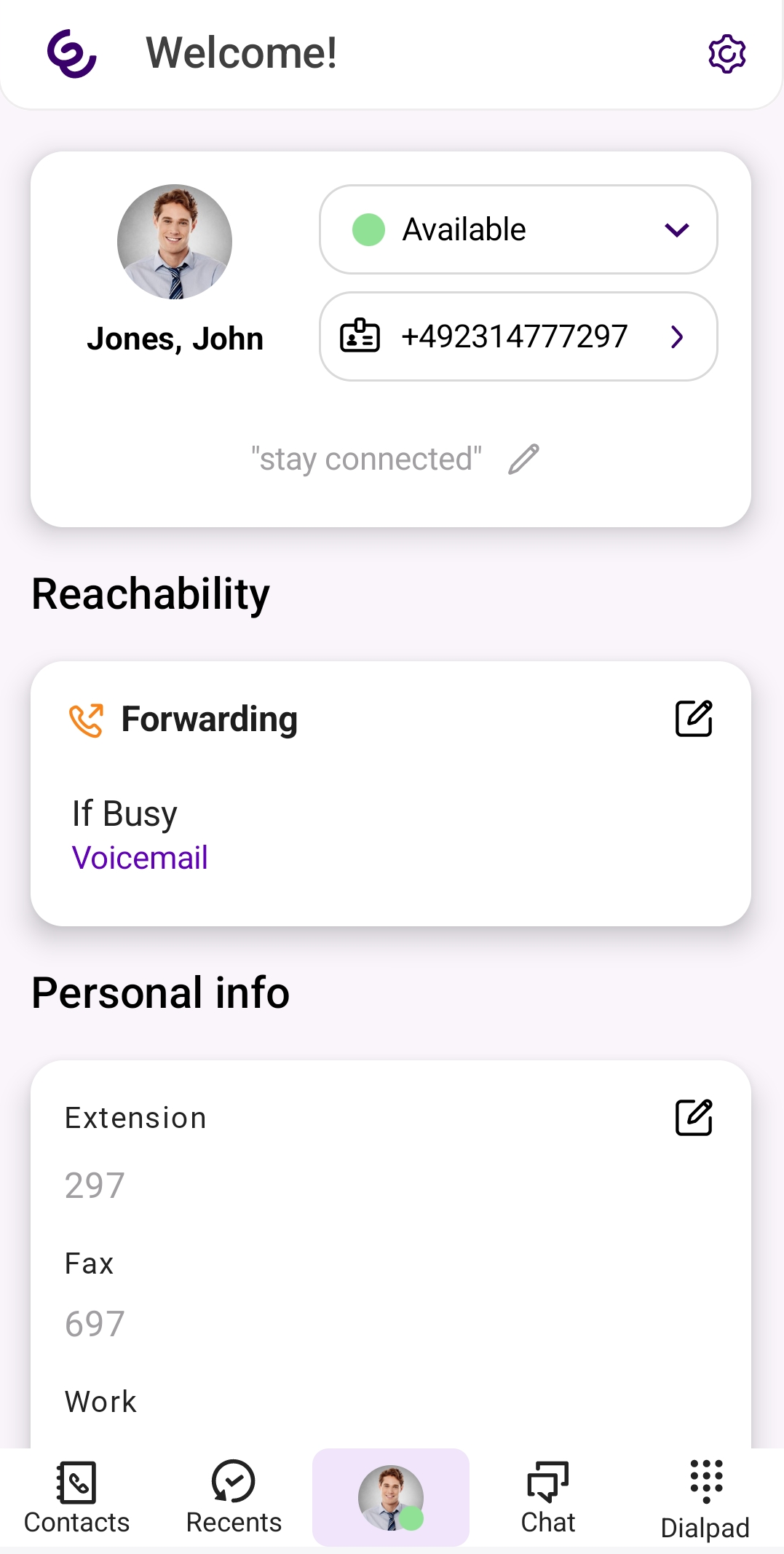 Status signaling and Caller ID and see at a glance which caller ID you use for outgoing calls. You can find further personal information such as your extension number or e-mail address under