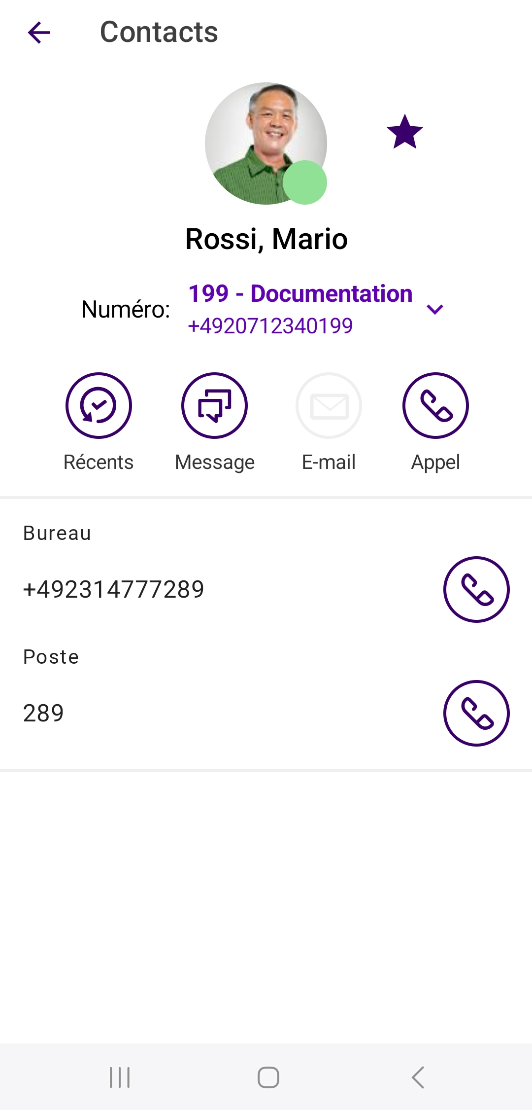 Lorsque vous appuyez sur un contact dans la liste des contacts, le profil du contact correspondant s'affiche. Vous pouvez y voir, si elle est enregistrée, la photo de profil, le message d'état et toutes les informations de contact disponibles (par exemple, les numéros de téléphone et l'adresse électronique) de votre contact. De là, vous pouvez directement passer des appels, envoyer un courriel à votre contact ou un message texte à .