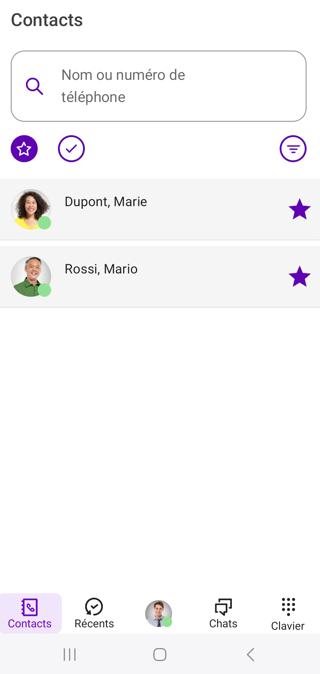 Dans le champ de recherche, vous pouvez rechercher vos contacts par nom et par numéro de téléphone. La recherche peut en outre être limitée par un filtre.