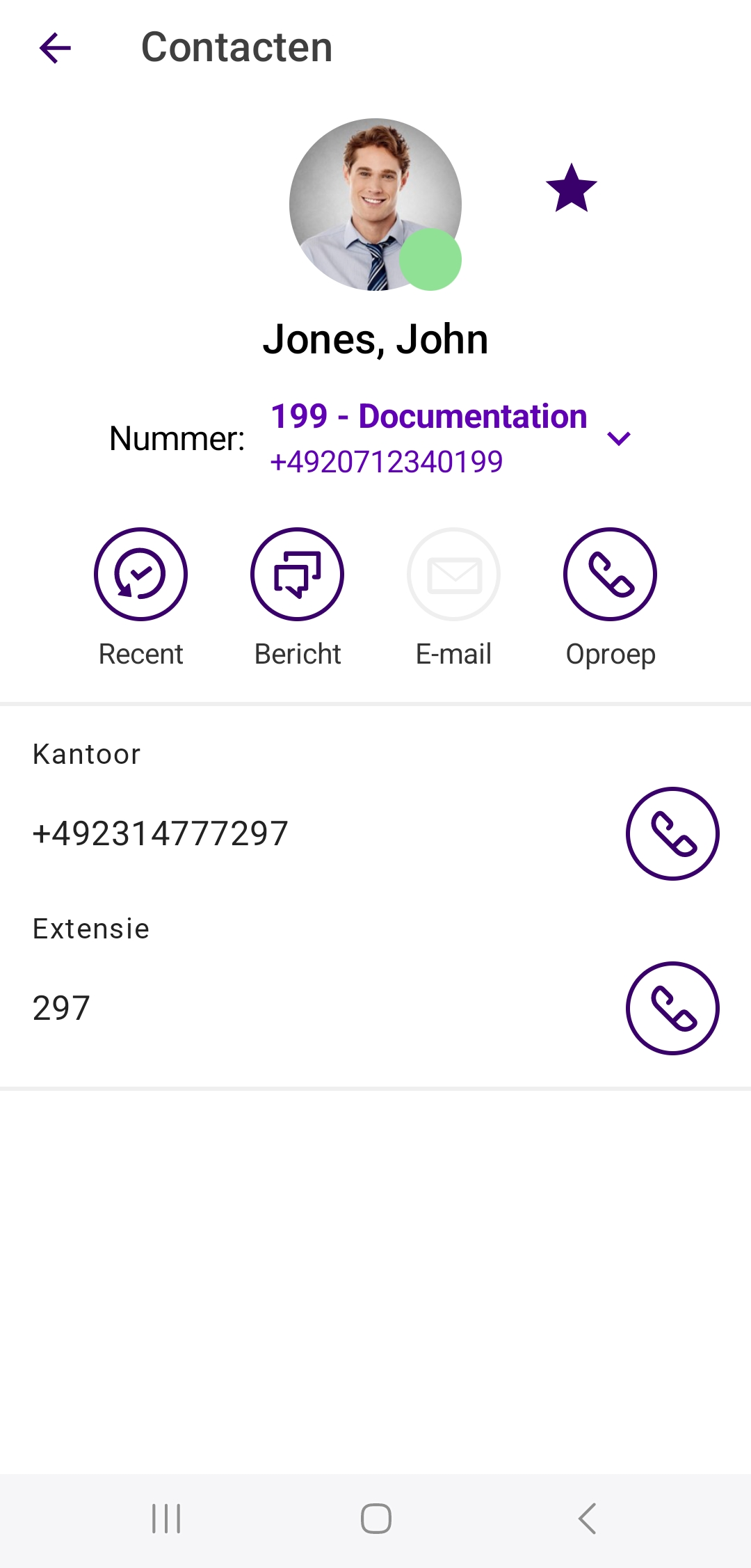 Als je op een contact in de contactenlijst tikt, verschijnt het bijbehorende profiel. Hier zie je, indien opgeslagen, de profielfoto, het statusbericht en alle beschikbare contactinformatie (bijv. telefoonnummers en emailadres) van je contactpersoon. Van hieruit kun je direct gesprekken starten, een e-mail naar je contact sturen of een sms sturen naar .