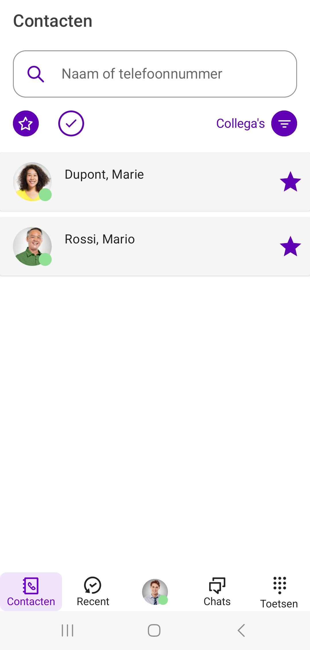 In het gedeelte Contacten vind je de contactgegevens van jouw collega's en, als jouw toegang toestaat, van jouw contacten die je op de smartphone hebt opgeslagen. Je kunt een filter gebruiken (Collega's, Bedrijf en Lokaal) om de weergave van contactpersonen te beperken. Je kunt ook alleen contactpersonen weergeven waarvan de status is ingesteld op Beschikbaar.