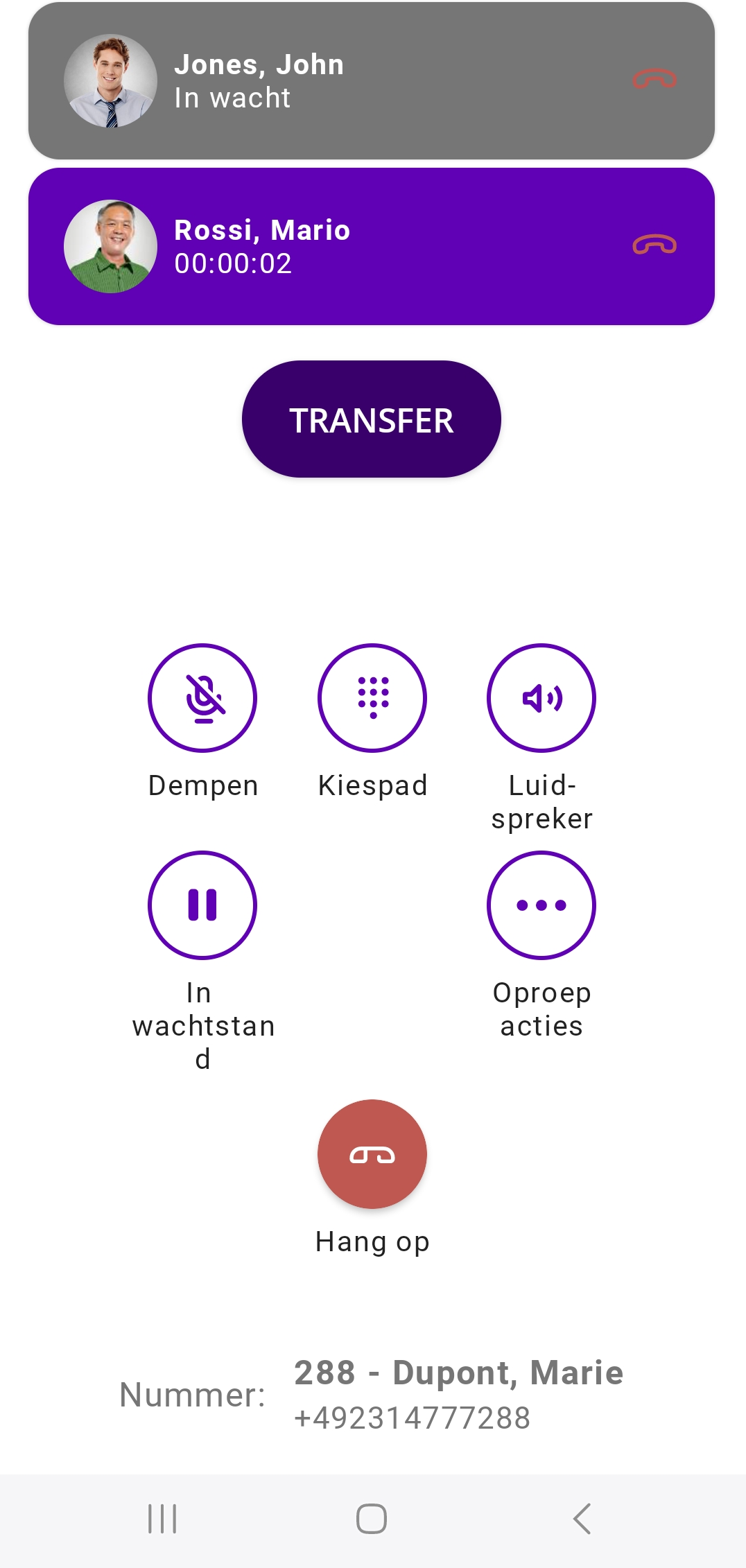 *Het betreffende contact wordt gebeld en het actieve gesprek wordt in de wacht gezet. De beller in de wacht hoort wachtmuziek.