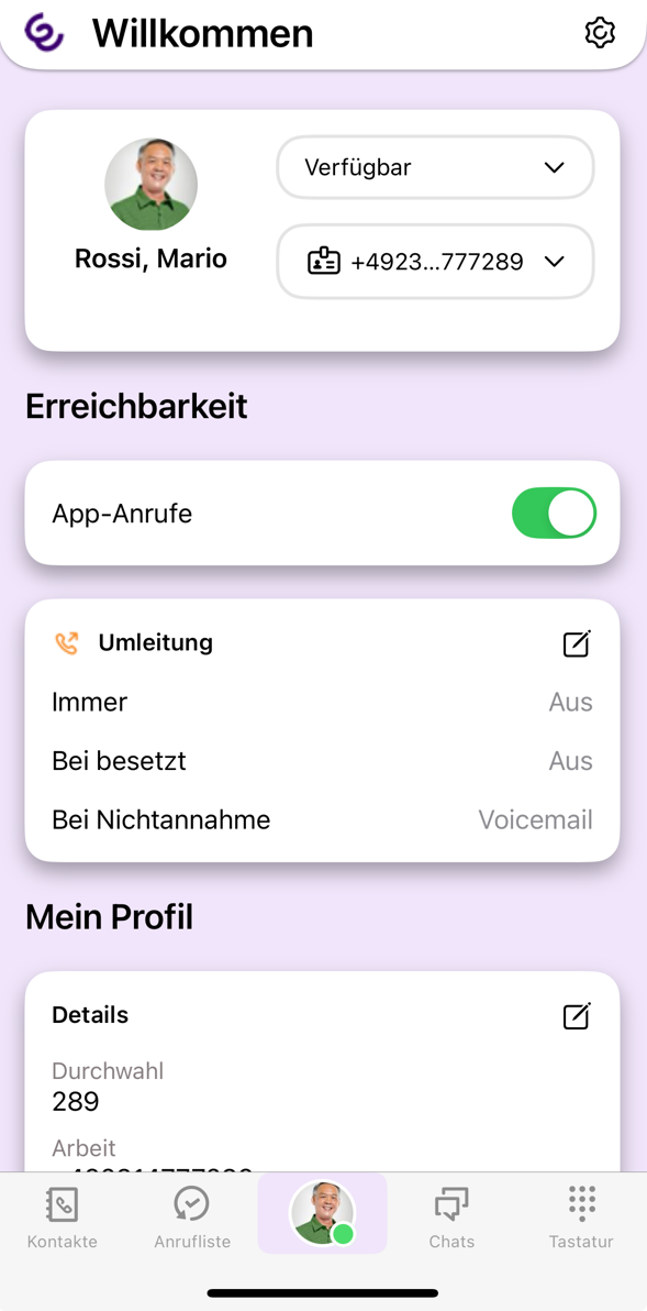 Statussignalisierung und Anrufer-ID wählen und auf einen Blick sehen welche Anrufer-ID Sie für ausgehende Anrufe nutzen. Weitere persönliche Informationen wie z. B. Ihre Durchwahl oder Ihre E-Mail-Adresse finden Sie unter