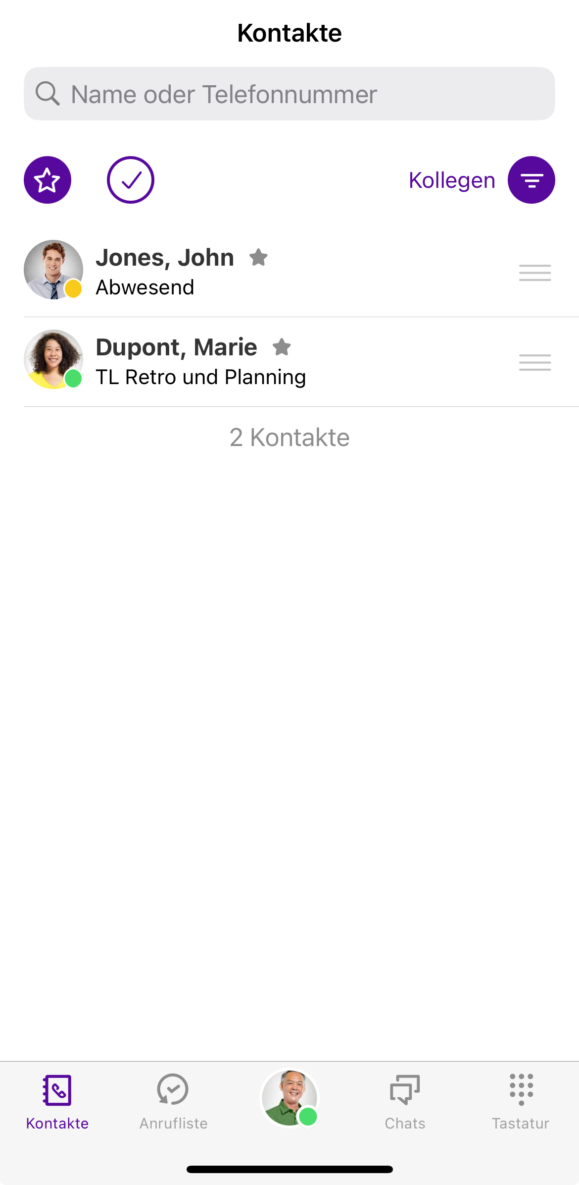 2 Um die Kontaktquelle zu ändern, tippen Sie auf den aktiven Filter Kollegen,Lokale oder Unternehmen.