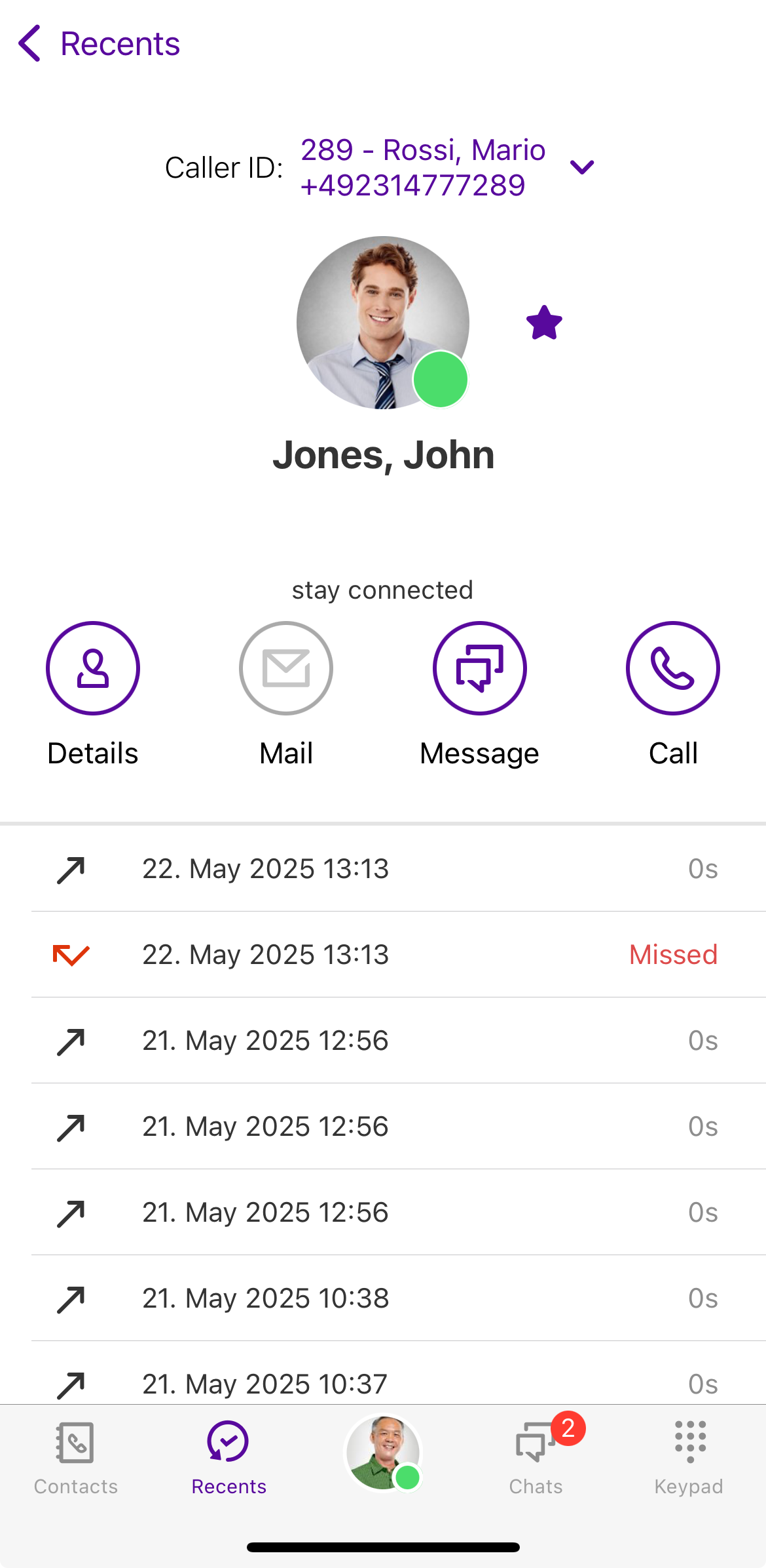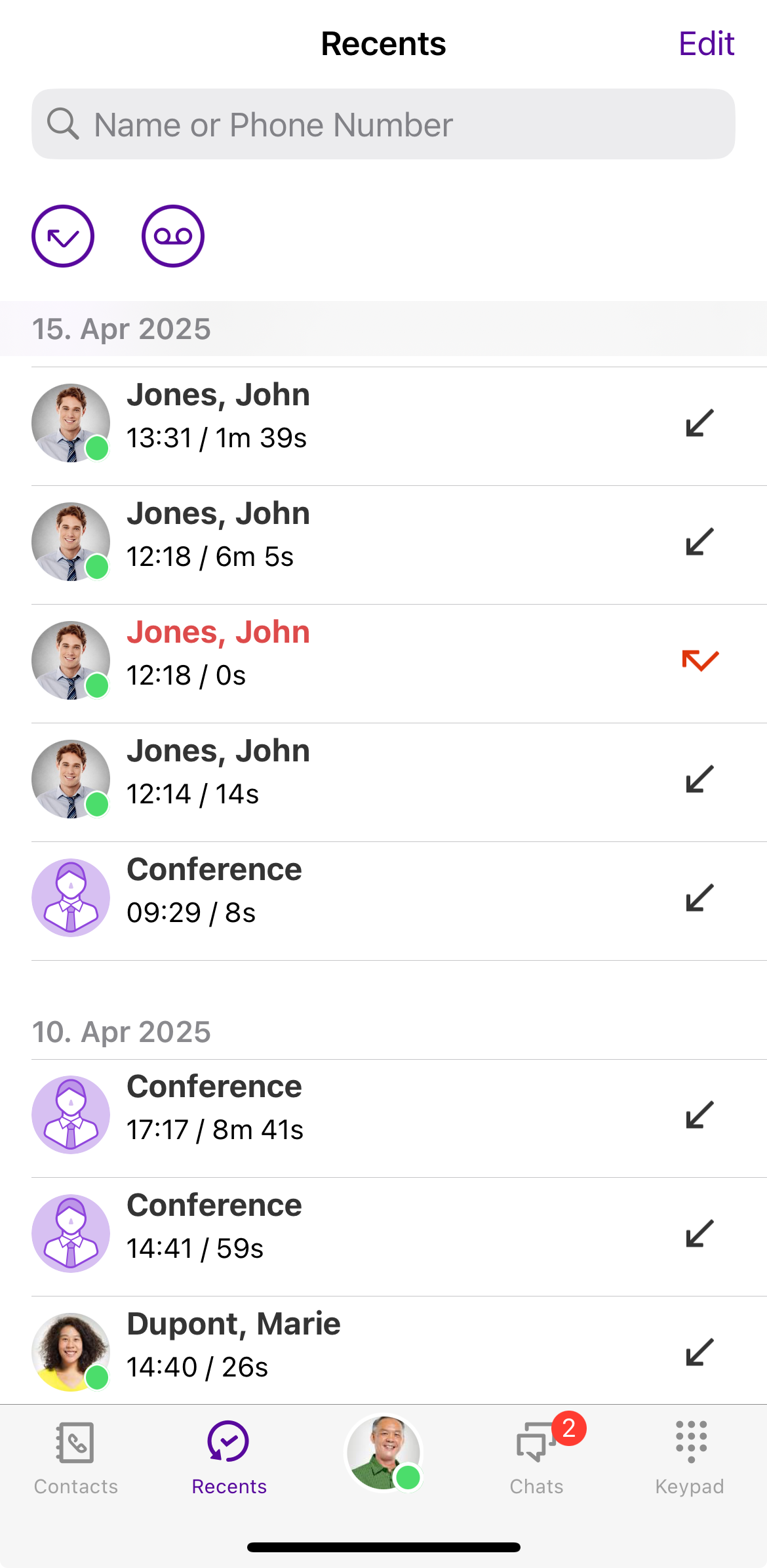 An arrow in the entry indicates whether it is a received, outgoing or missed call. If you have received a voicemail, this is also indicated with an icon.