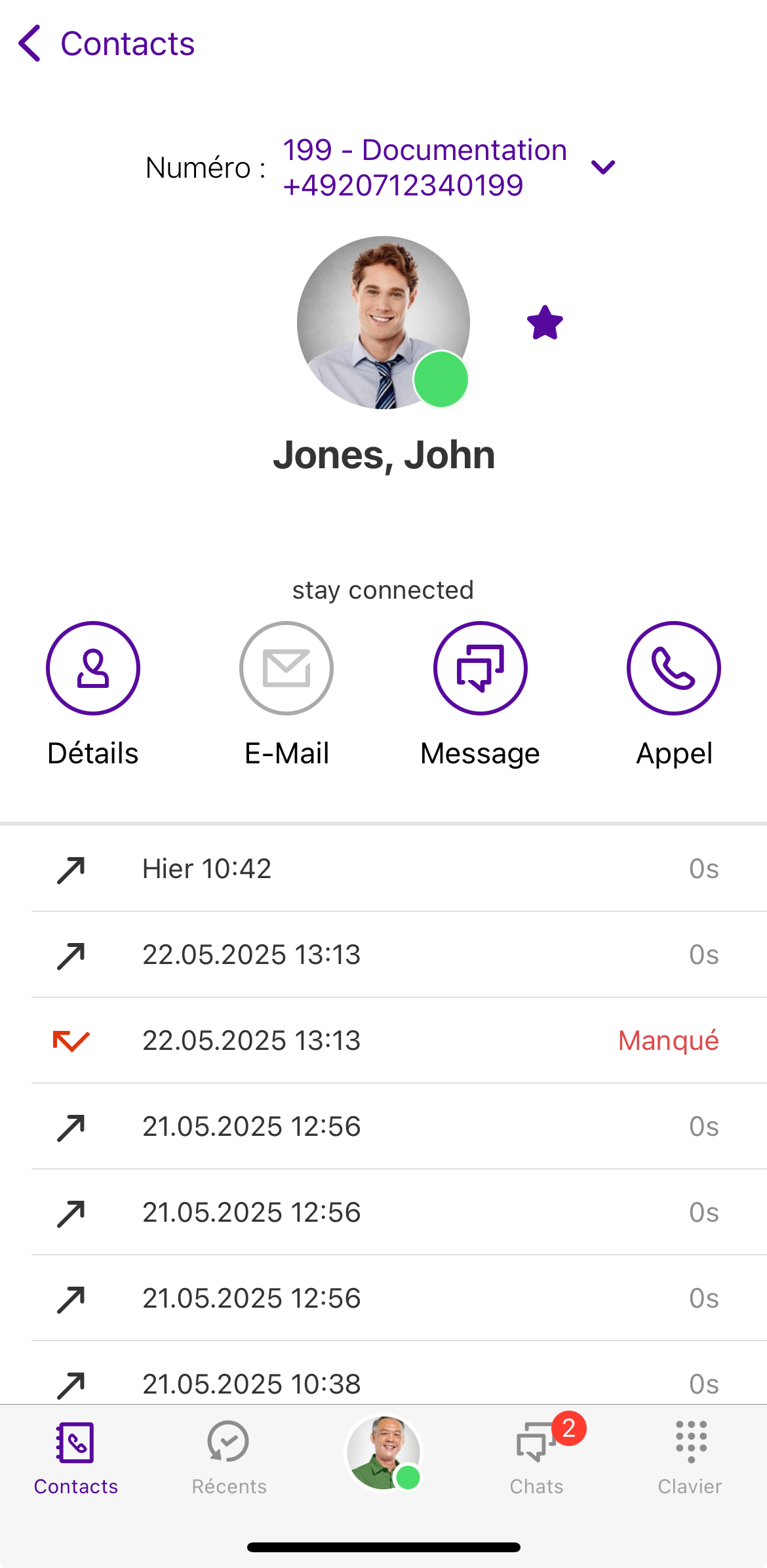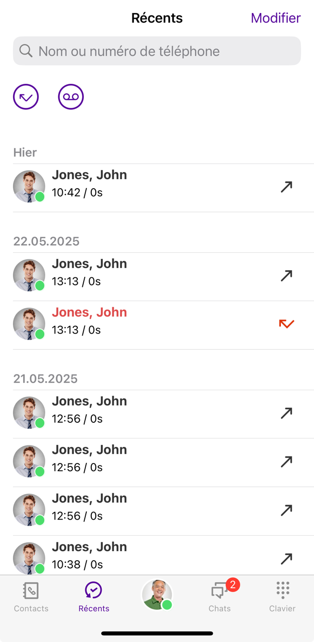 Dans la section Récents, tous les appels reçus et effectués sont classés par ordre chronologique.