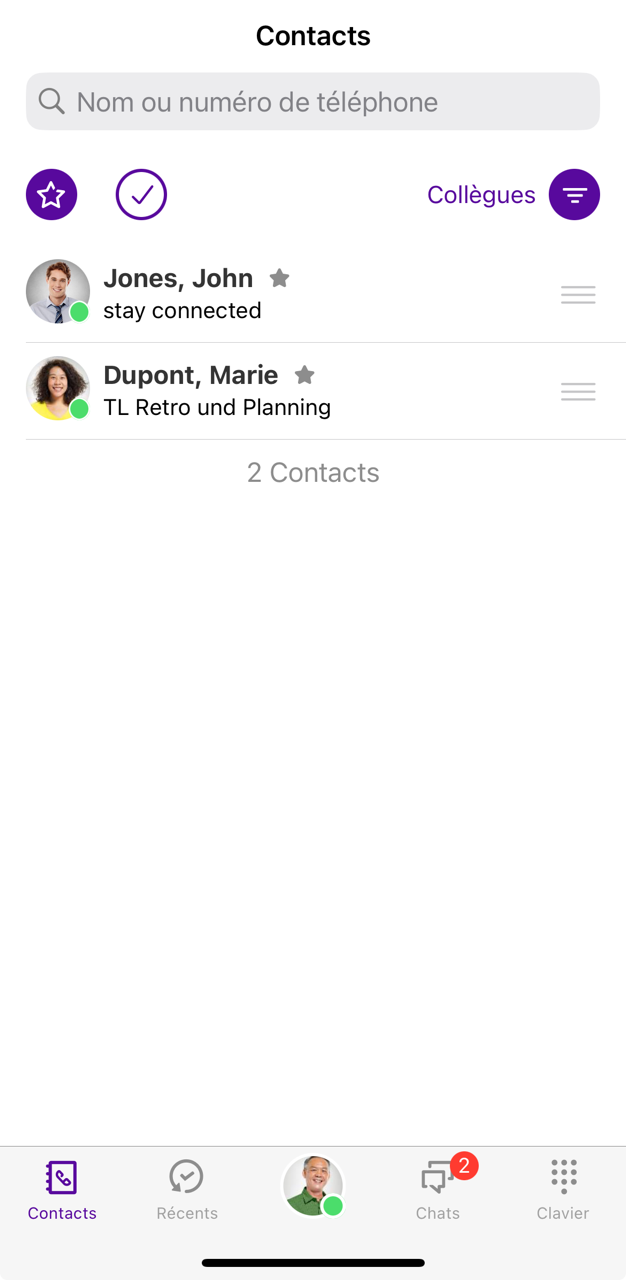 2 Pour modifier la source de contact, appuyez sur le filtre actif Collègues,Local ou Entreprise.