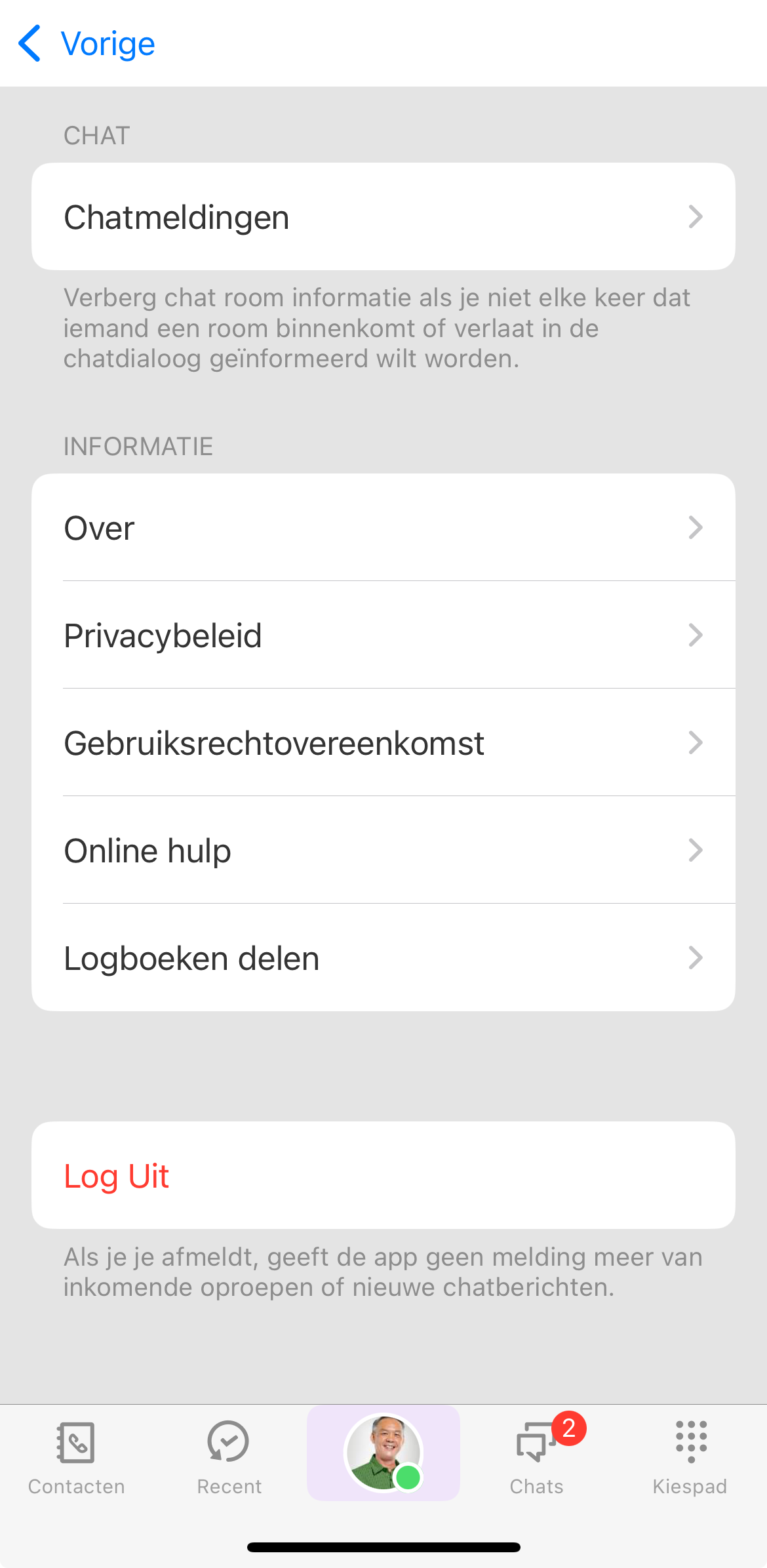 menu kun je verschillende instellingen voor verschillende delen van de app maken en uitloggen van Swyx Mobile. Zie ook
