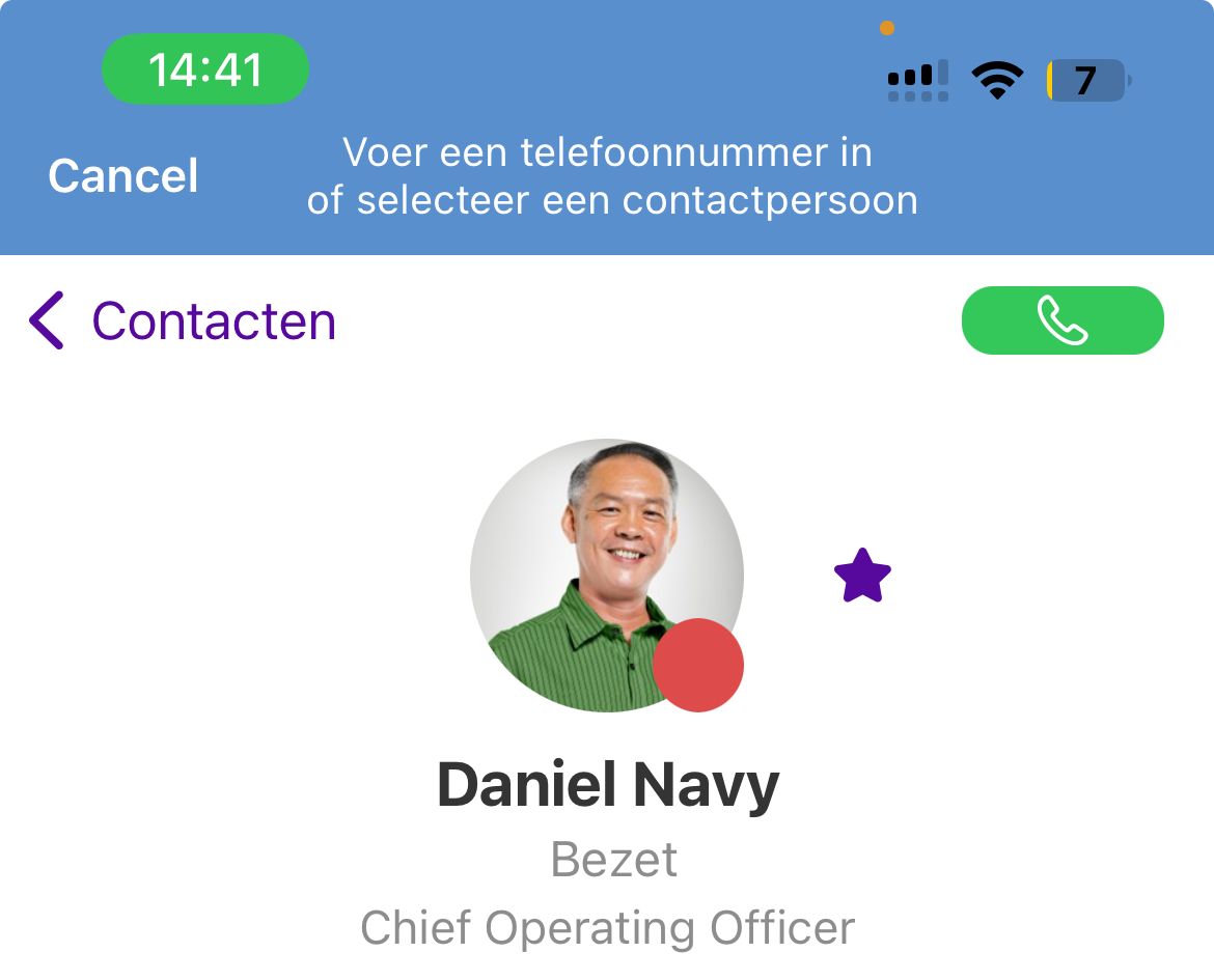 Tijdens een actief gesprek kunt je door de secties van Swyx Mobile bladeren of andere toepassingen gebruiken. Actieve gesprekken worden op twee verschillende manieren aangegeven: een groene balk in de statusbalk en een groene toest in elk sectie van Swyx Mobile. Dit kan worden gebruikt om terug te keren naar de app of naar het gesprek.