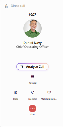 Once a call is established, you can open the keypad to enter DTMF digits, transfer the active call to another destination, put the call on hold, and perform a device switch to seamlessly transfer an active call to another device.