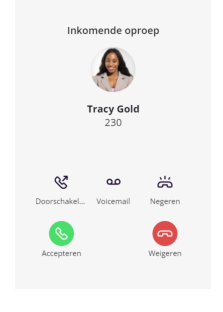 Als je een inkomend gesprek ontvangt, heb je verschillende opties. Je kunt het gesprek aannemen, doorschakelen naar een andere bestemming, zoals een collega of je voicemail, of weigeren.