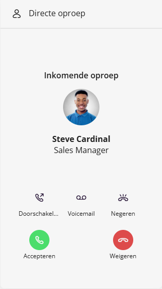 Wanneer je een inkomende oproep ontvangt op het apparaat dat je hebt geselecteerd, zie Apparaat voor inkomende gesprekken, heb je verschillende opties. Je kunt het gesprek aannemen, doorschakelen naar een andere bestemming, zoals een collega of je voicemail, of weigeren.