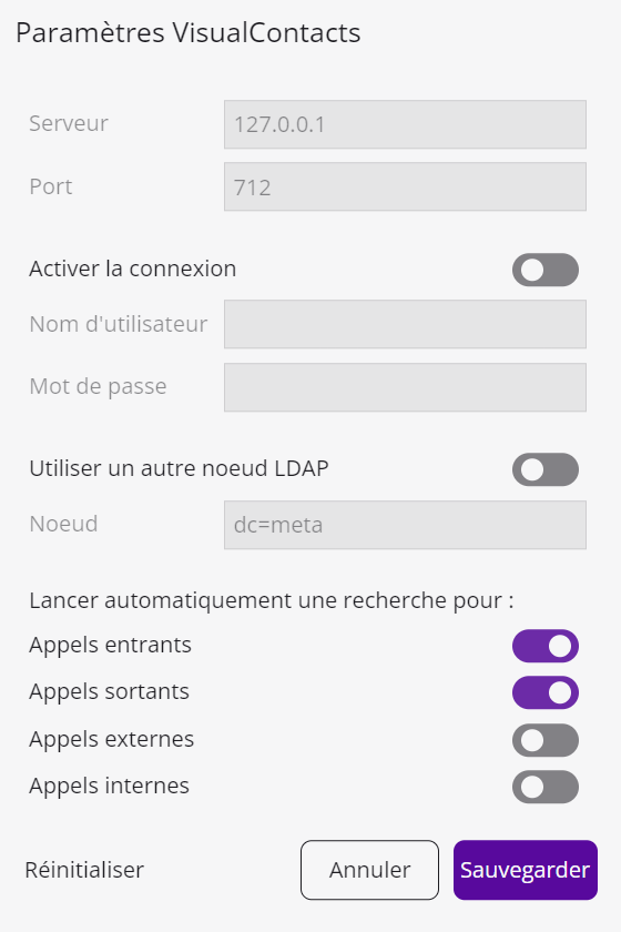Dans les paramètres, vous pouvez définir les types d'appels pour lesquels la recherche automatique doit être lancée. Pour un type d'un appel pour lequel la recherche automatique a été activée, les entrées trouvées pour l'appelant concerné s'affichent automatiquement sur l'interface Swyx VisualContacts dans Swyx Connector pour Microsoft Teams.