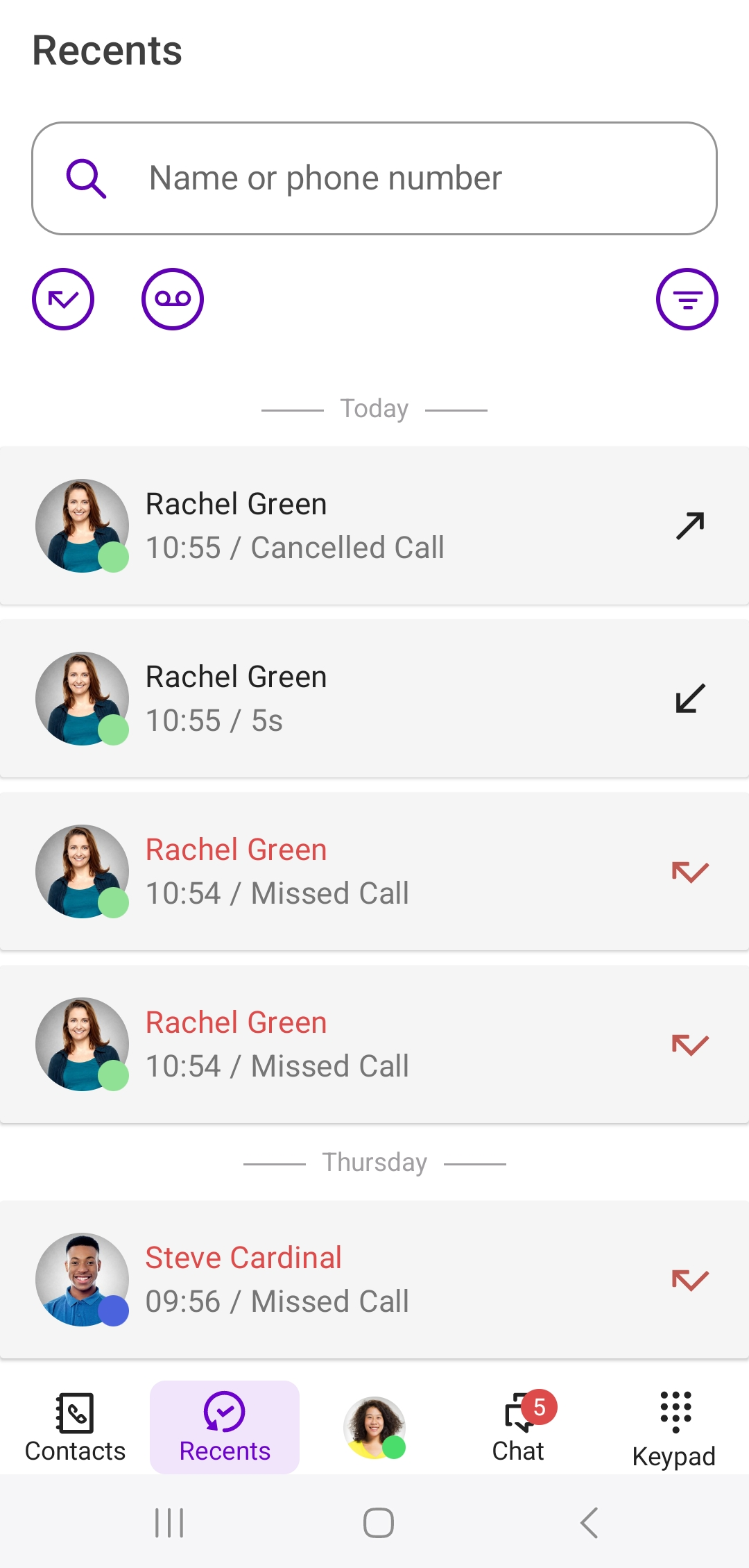 In the Recents section, all received and made calls are listed chronologically.