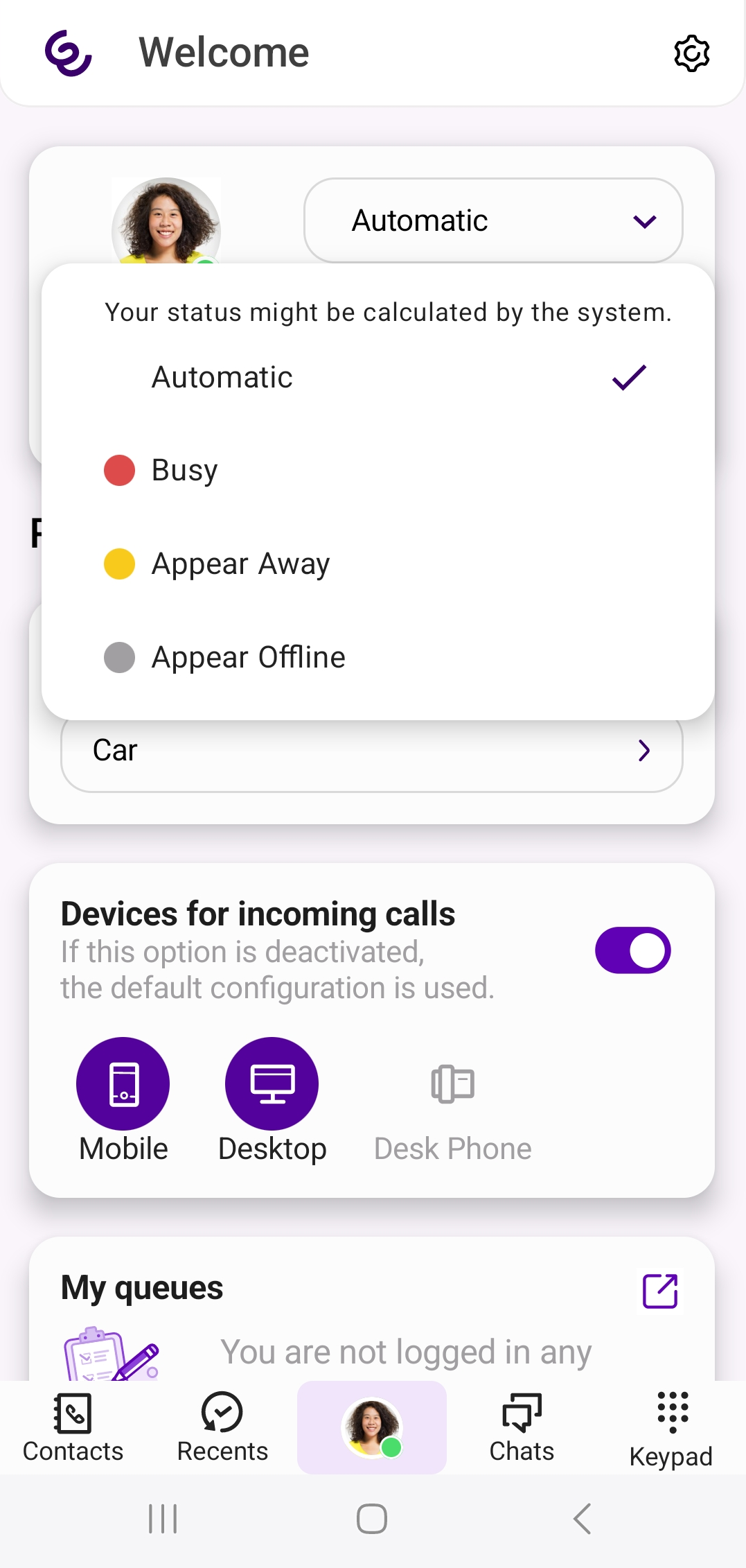 You can select your own status. The available options are Automatic, Appear Away, Busy and Appear Offline.