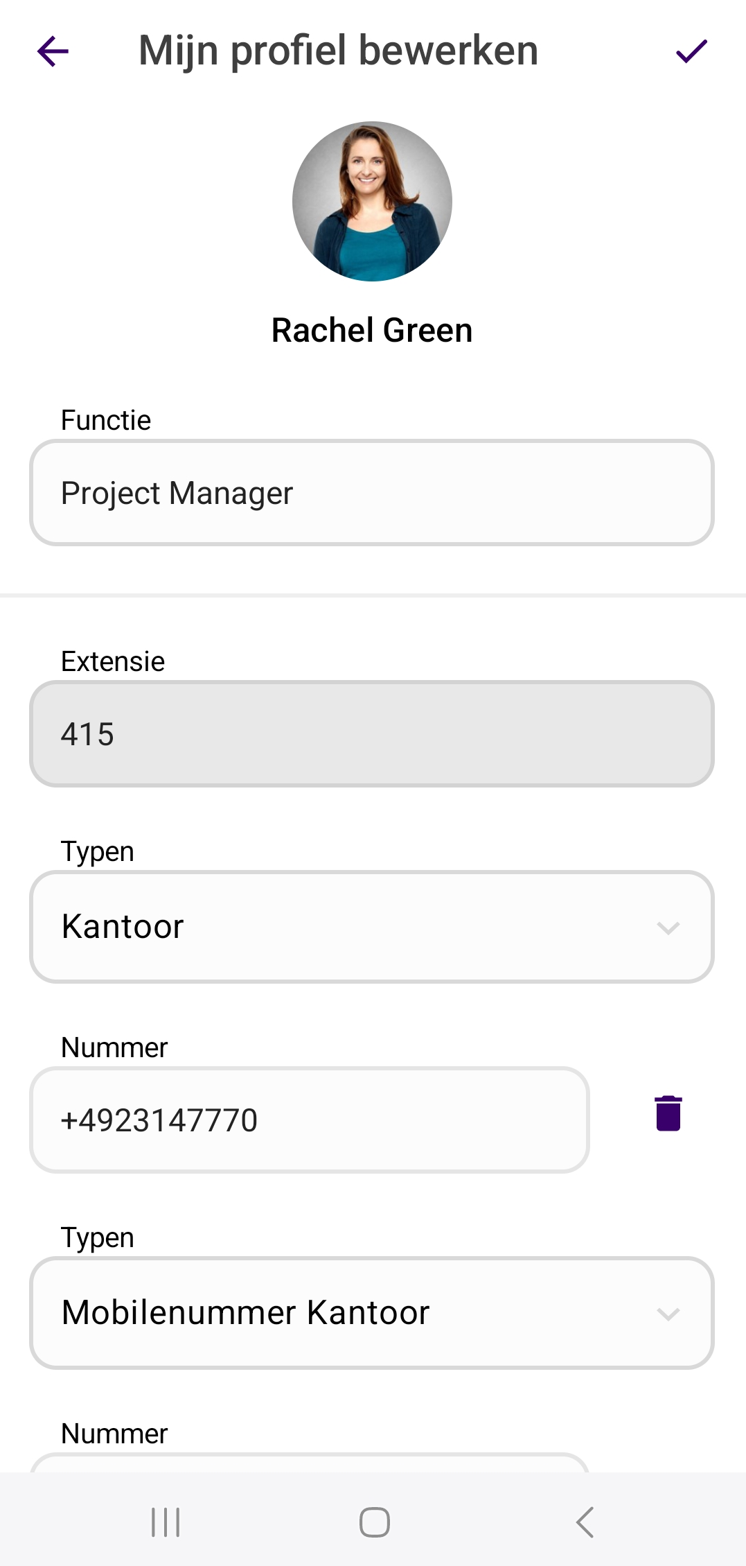 In het gedeelte Mijn profiel kun je jouw extensie, je verschillende telefoonnummers en je e-mailadres zien en