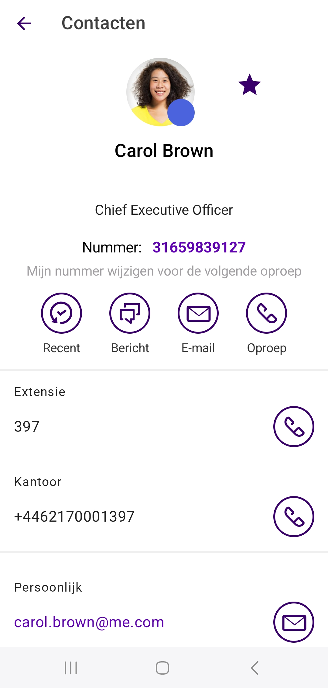 Als je op een contact in de contactenlijst tikt, verschijnt het bijbehorende profiel. Hier zie je, indien opgeslagen, de profielfoto, het statusbericht en alle beschikbare contactinformatie (bijv. telefoonnummers en emailadres) van je contactpersoon. Van hieruit kun je direct gesprekken beginnen, contacten aan je favorieten toevoegen en ook een e-mail of een sms naar je contact sturen.