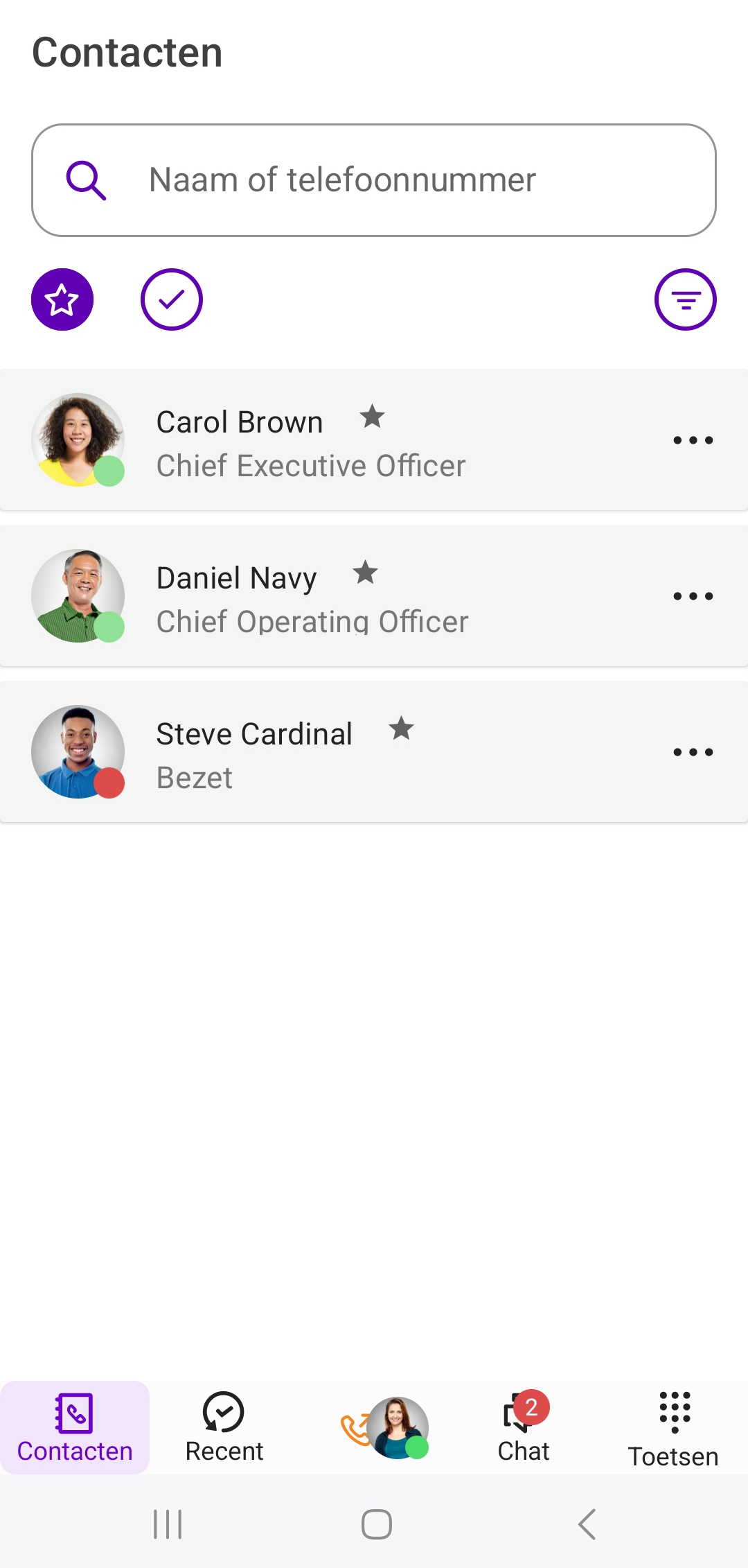 In het gedeelte Contacten vind je de contactgegevens van jouw collega's en, als jouw toegang toestaat, van jouw contacten die je op de smartphone hebt opgeslagen. Je kunt contacten aan jouw favorieten toevoegen. Je kunt een filter gebruiken (Collega's, Bedrijf, Persoonlijk en Lokaal) om de weergave van contacten te beperken. Je kunt de weergave van jouw contacten ook filteren op favorieten, en alleen contacten tonen waarvan de status op Beschikbaar is gezet.