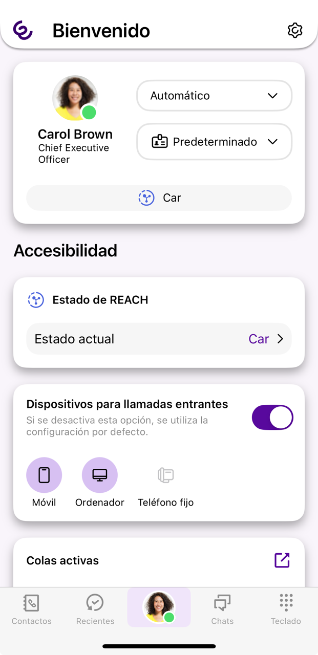 Mis colas puedes ver en qué colas estás conectado. Puedes encontrar más información personal, como tu número de extensión o tu dirección de correo electrónico, en