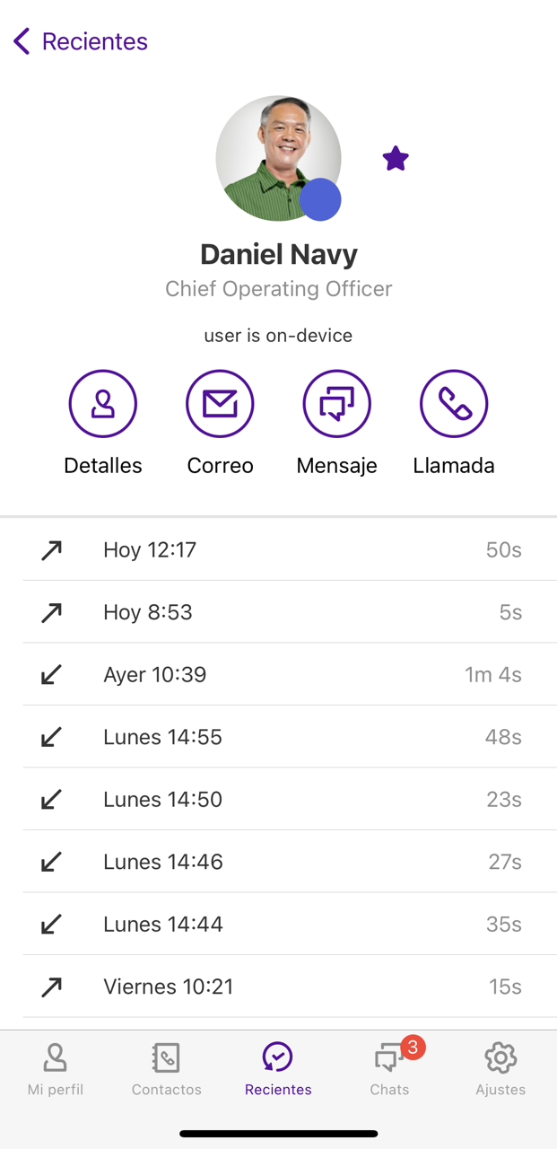 Tienes varias opciones a través del perfil de tus contactos. Puedes ver la foto de perfil, el mensaje de presencia y toda la información de contacto disponible (por ejemplo, números de teléfono y direcciones de correo electrónico) de tu contacto, si está almacenada. Desde aquí puedes iniciar llamadas directamente, añadir contactos a tus favoritos, así como enviar un correo electrónico o un mensaje directo.