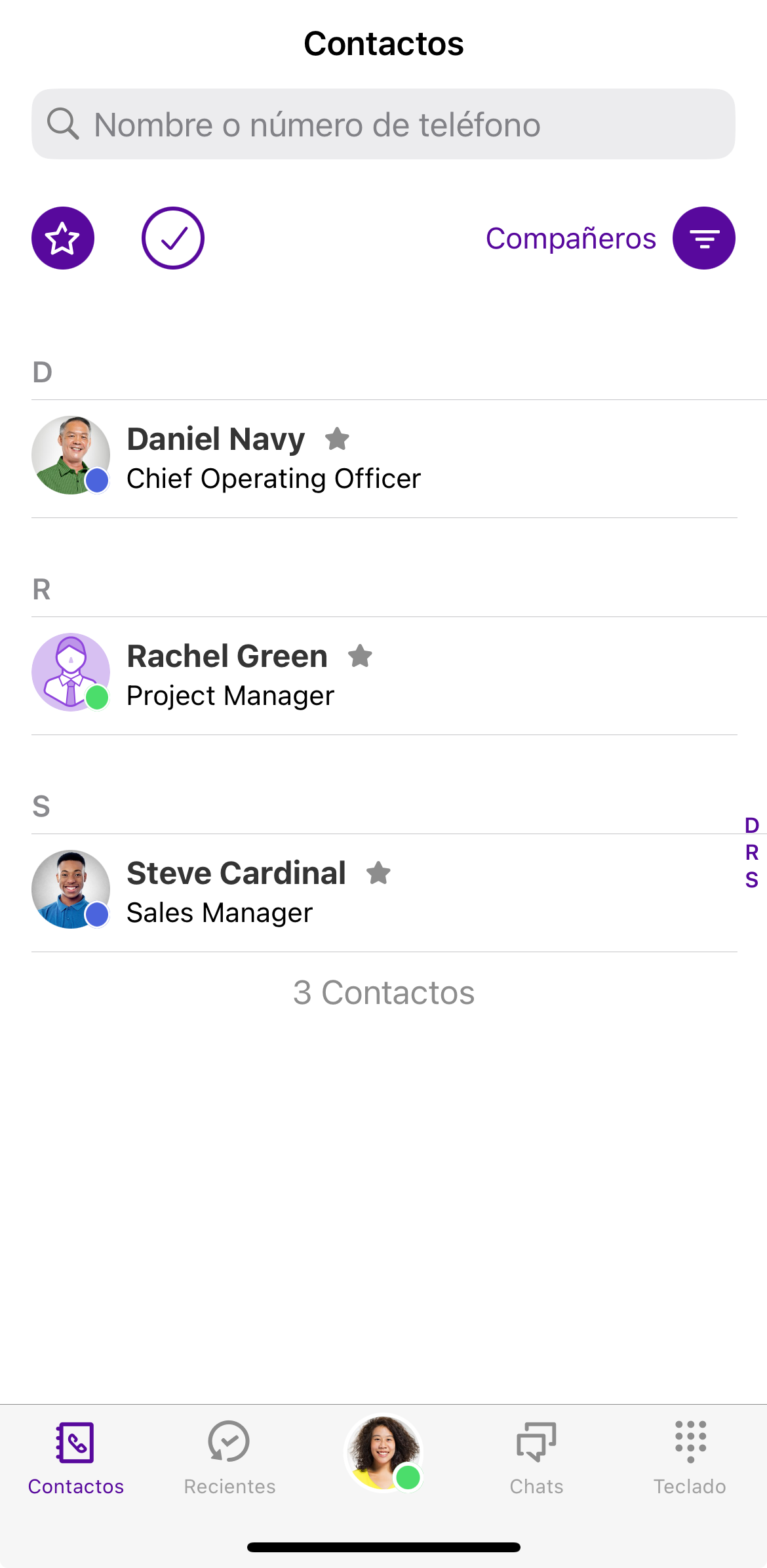 2 Para cambiar la fuente de contactos, pulsa sobre el filtro activo Compañeros,Servicios, Personales, Locales, Grupos, Colas o Empresa.