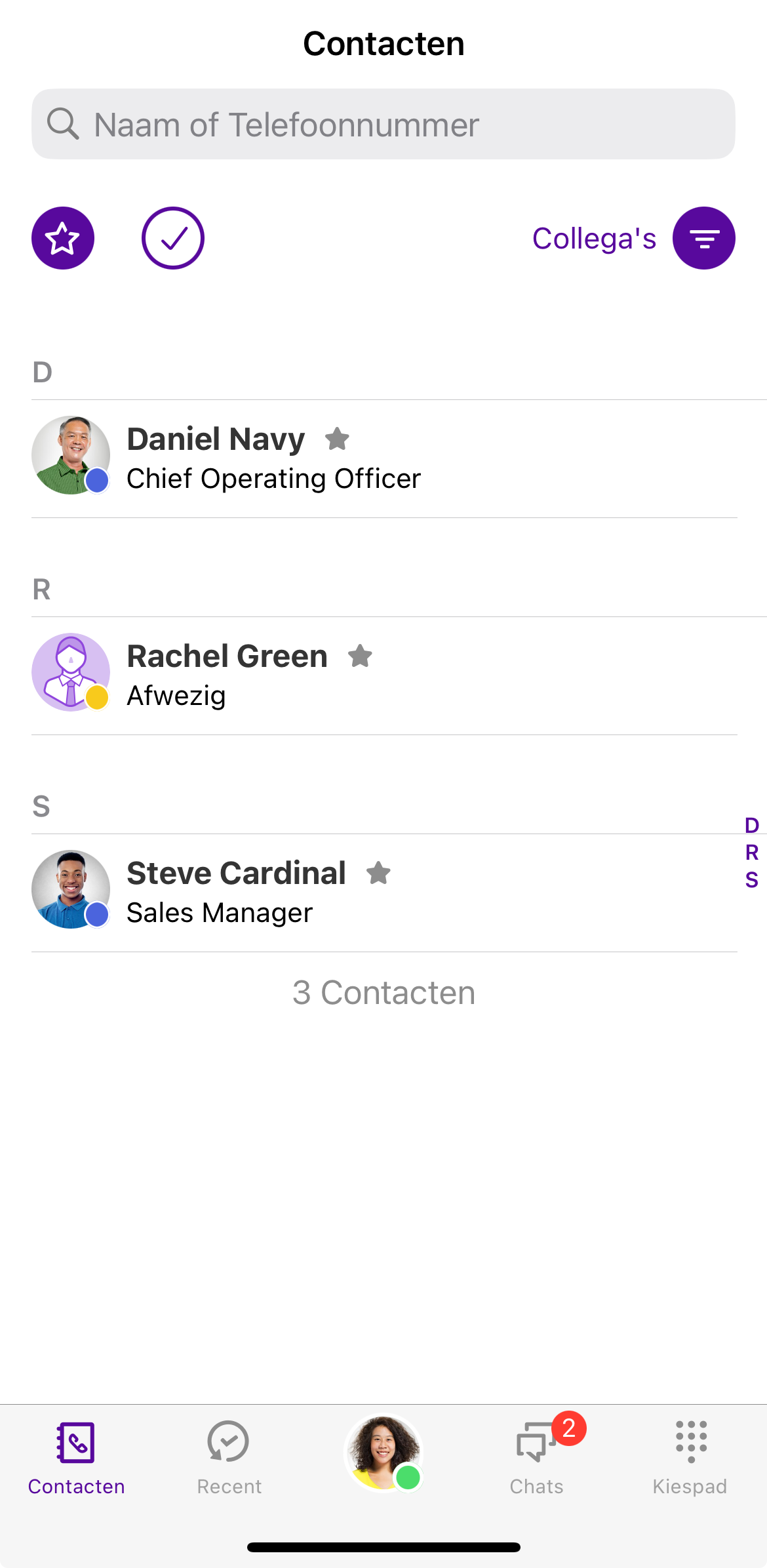 2 Om de contactbron te wijzigen, tikt je op het actieve filter Collega's,Diensten, Persoonlijk, Lokaal, Groepen, Wachtrijen of Bedrijf.