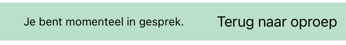 Tijdens een actief gesprek kunt je door de secties van Enreach Contact bladeren of andere toepassingen gebruiken. Actieve gesprekken worden op twee verschillende manieren aangegeven: een groene balk in de statusbalk en een groene toest in elk sectie van Enreach Contact. Dit kan worden gebruikt om terug te keren naar de app of naar het gesprek.
